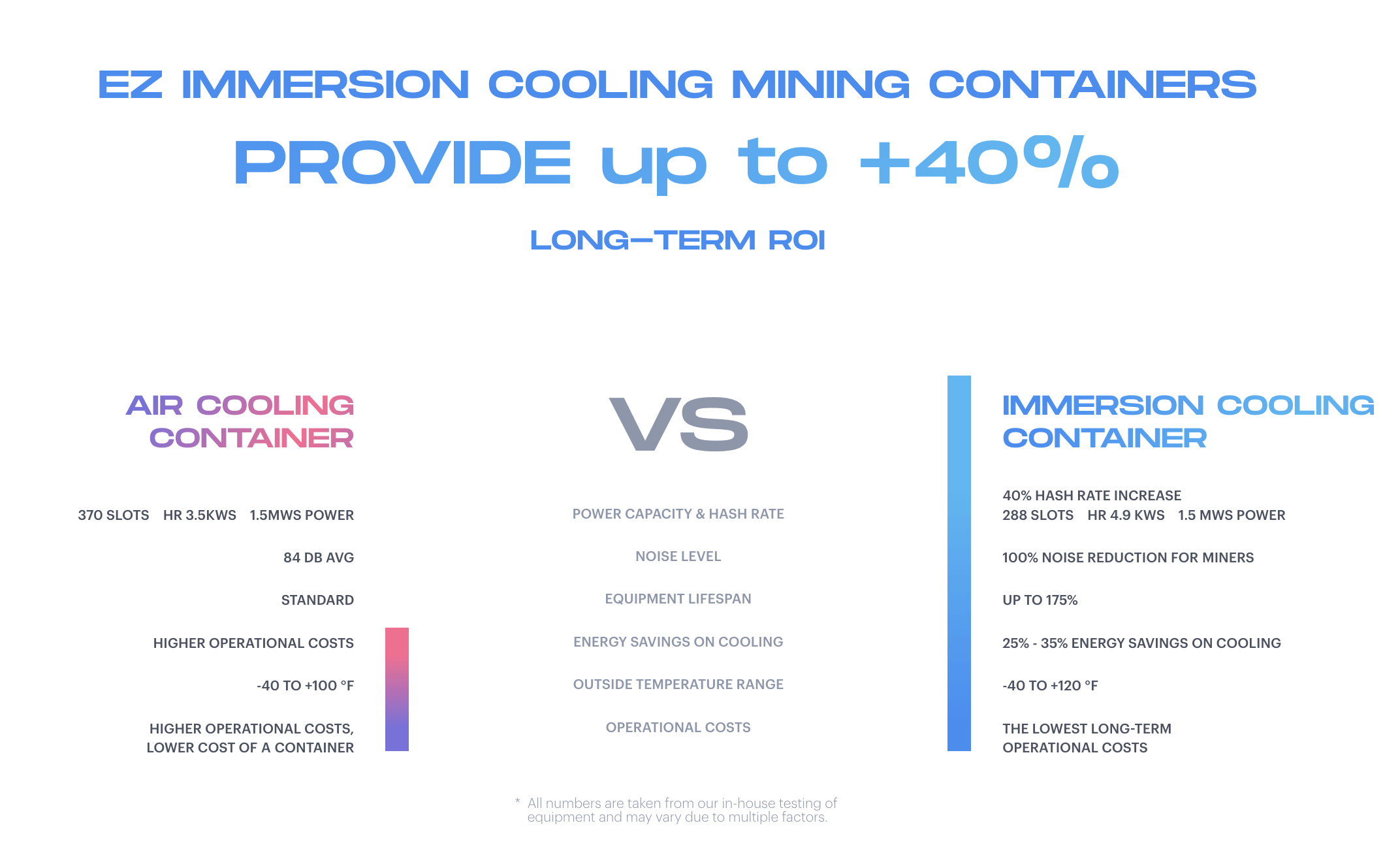 This is because the dielectric fluid used in these containers absorbs and dissipates heat away from the system, allowing miners to run at optimal speeds without needing to constantly disperse heat.