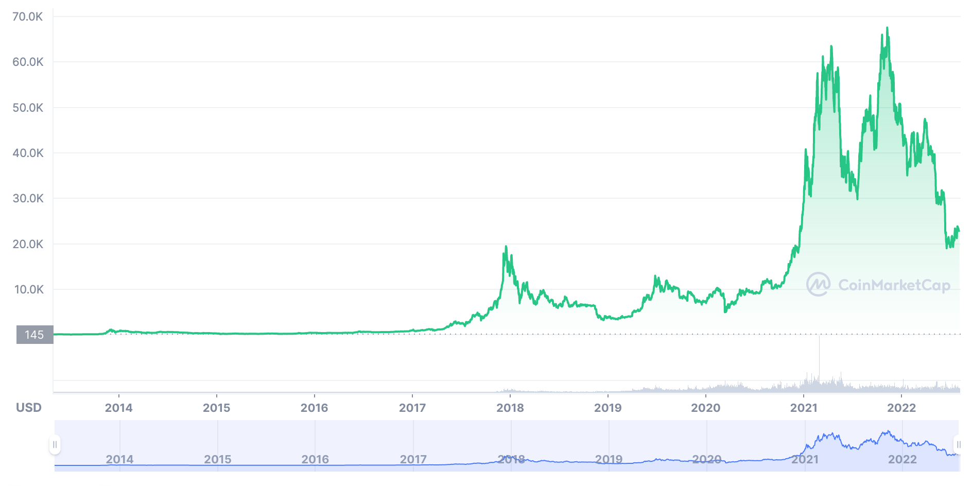 Bitcoin is currently playing a little bit more the $20,000 mark, according to Coinmarketcap figures. It’s a $40,000 drop from its all-time high in November 2021, but the crypto giant could be in for deeper troughs if its historical data is anything to go by.